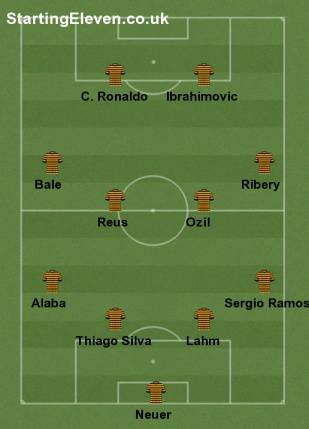 centrocampisti: Franck Ribery (Bayern Monaco), Marco Reus (Borussia Dortmund), Mesut Ozil (Real Madrid/Arsenal), Gareth Bale (Tottenham/Real Madrid)