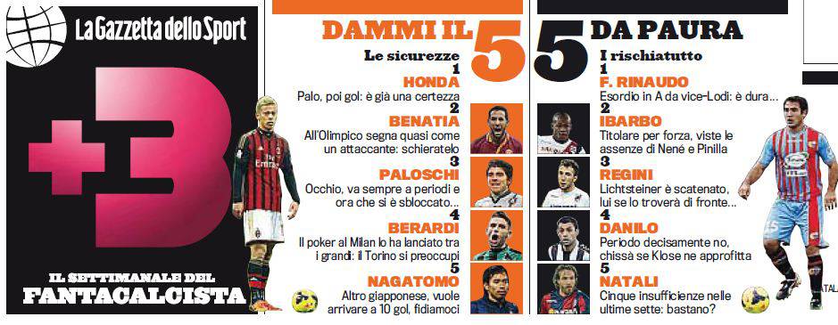 FOTO FANTACALCIO CONSIGLI 20^ 5 SCHIERARE 5 RISCHIARE – Come ogni sabato, è giunto il momento di schierare le formazioni per il vostro Fantacalcio. Amici fantallenatori unitevi: concluso il girone d’andata, è il momento di non sbagliare più un colpo nella corsa verso la vittoria finale del fantacampionato. Ci giunge in aiuto, anche questa settimana, la Gazzetta dello Sport con i suoi consigli: ecco i 5 calciatori da schierare certamente ed i 5 ad alto tasso di rischio. Tra le certezze troviamo Keisuke Honda, Mehdi Benatia, Alberto Paloschi, Mimmo Berardi e Yuto Nagatomo. Tra i calciatori da rischiare spiccano invece Rinaudo, Ibarbo, Regini, Danilo e Natali.