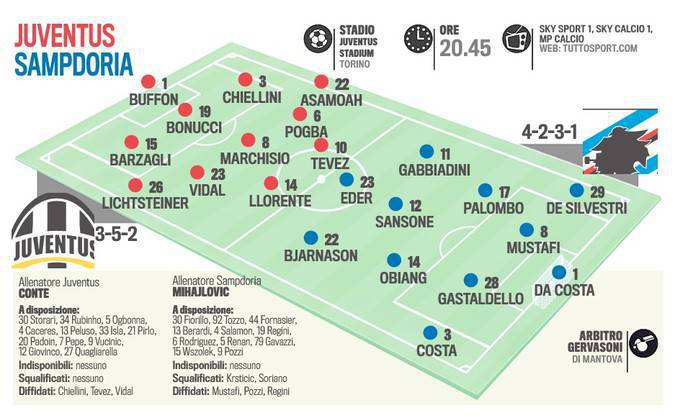 FOTO JUVENTUS SAMPDORIA MARCHISIO PIRLO EDER – La Juventus ha intenzione di continuare la striscia positiva in campionato e toccare quota 12 vittorie consecutive. I bianconeri questa sera affronteranno la Sampdoria alle ore 20.45. Conte ha un dubbio a centrocampo, Marchisio potrebbe essere titolare a differenza di Andrea Pirlo che potrebbe restare in panchina. Per il resto solita formazione di sempre con il trio Barzagli, Chiellini e Bonucci davanti a Buffon, Asamoah e Lichtsteiner ai lati con Vidal e Pogba accanto a Marchisio, Tevez e Llorente in attacco. Nella Sampdoria 4-2-3-1 con Eder unica punta, dietro di lui Gabbiadini, Sansone, Bjarnason. Le probabili formazioni secondo Tuttosport.