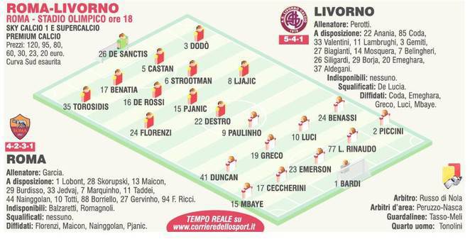 FOTO ROMA LIVORNO GARCIA PEROTTI – Quest’oggi alle ore 18 la Roma di Rudi Garcia darà il via al girone di ritorno anticipando il match contro il Livorno del nuovo tecnico Perotti. I giallorossi giocheranno con il 4-2-3-1 con De Rossi e Strootman come cintura di centrocampo, Pjanic con Florenzi e Ljajic dietro Destro. Panchina per il nuovo arrivato Nainggolan e per Maicon che verrà sostituito da Torosidis. Dodò a sinistra e la coppia centrale Castan-Benatia completano la squadra dinanzi a De Sanctis. Il Livorno di Perotti invece si copre utilizzando il 5-4-1. Le probabili formazioni del Corriere dello Sport.