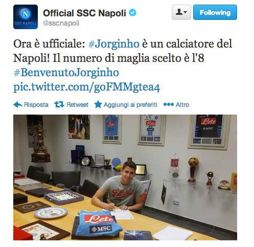 FOTO UFFICIALE JORGINHO NAPOLI – E’ arrivata l’ufficializzazione del passaggio di Jorginho dall’Hellas Verona al Napoli. Il calciatore italo-brasiliano ha firmato il contratto che lo legherà al club partenopeo fino al 2018. Jorginho ha scelto di indossare la maglia numero 8.