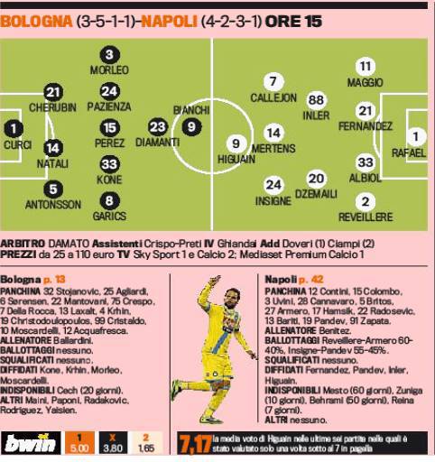 BOLOGNA NAPOLI PROBABILI FORMAZIONI – Il Napoli deve rispondere alle vittorie di Roma e Juventus e dovrà farlo contro un Bologna alla continua ricerca di punti importanti per la salvezza. Rafa Benitez, nonostante il recupero di Hamsik, non lo schiererà dal primo minuto e metterà in campo il Napoli con il 4-2-3-1 con Rafael tra i pali, Maggio, Fernandez, Albiol, Reveillere, in difesa. Inler e Dzemail in mezzo al campo. Callejon, Mertens e Insigne sulla trequarti con Higuain unica punta. Ballardini risponde con il 3-5-1-1 con Curci in porta; Antonsson, Natali e Cherubin in difesa; Garics, Kone, Perez, Pazienza e Morleo a centrocampo. Diamanti sulla trequarti a sostegno dell’unica punta che sarà Bianchi.