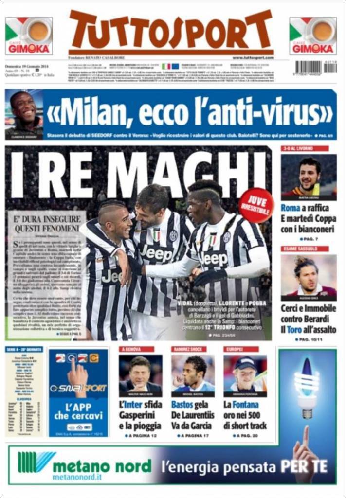 RASSEGNA STAMPA TUTTOSPORT – –Vidal, Llorente e Pogba cancellano i brividi per l’autogol di Barzagli e il gol di Gabbiadini. Liquidata anche la Sampdoria. I bianconeri centrano il dodicesimo trionfo. Roma a raffica: e martedì in Coppa con i bianconeri. Milan, ecco l’antivirus.