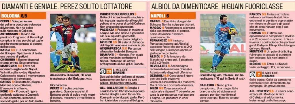 FOTO BOLOGNA NAPOLI VOTI PAGELLE GAZZETTA BIANCHI HIGUAIN – Il Napoli si ferma a Bologna e si allontana dal duo di testa formato a Juventus e Roma. I partenopei passano in svantaggio con il gol di Bianchi, bomber ritrovato e rigenerato dalla cura Ballardini. L’uno a uno di Higuain prima e il gol di Callejon poi fanno pensare a una vittoria ma nel finale un Bologna corsaro, in dieci uomini, trova il pareggio ancora con Bianchi migliore in campo. Male Kone che provoca il rigore e si fa cacciare via. Nel Napoli sontuosa partita di Higuain. Voti e pagelle della Gazzetta.
