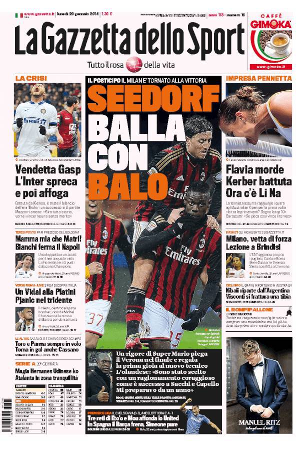 GAZZETTA SEEDORF – Un gol di Balotelli su rigore regala la vittoria al Milan contro il Verona. Buon debutto di Seedorf allenatore.