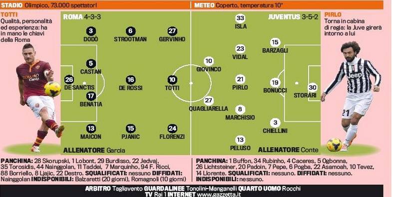 FOTO ROMA JUVENTUS GARCIA FLORENZI TURNOVER CONTE – Questa sera allo stadio Olimpico andrà di scena il grande match tra Roma e Juventus valido per l’accesso alle semifinali di Coppa Italia. Dinanzi le due regine del campionato, la capolista Juventus affronterà la Roma di Garcia seconda in campionato e già battuta tre a zero in questa stagione a Torino. Garcia sceglie Florenzi largo nel tridente d’attacco con Totti e Gervinho, centrocampo titolare con Strootman, De Rossi e Pjanic. Anche la difesa è quella titolare. La Juventus invece fa turnover, Storari in porta, Isla e Peluso al posto di Lichtsteiner e Asamoah, torna Pirlo a centrocampo, riposa Pogba. Quagliarella-Giovinco in attacco. Le probabili formazioni secondo la Gazzetta dello Sport.