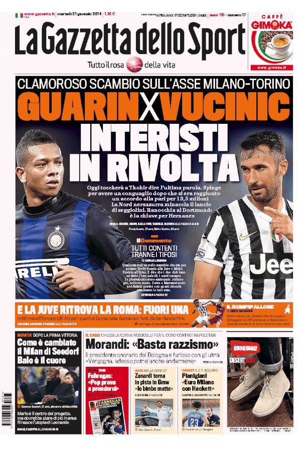 GAZZETTA GUARIN VUCINIC – La Gazzetta dello Sport parla ovviamente dello scambio tra Guarin e Vucinic, serve l’ok di Thohir.