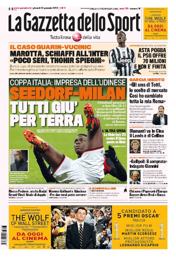 GAZZETTA SEEDORF – Sulla Gazzetta dello Sport si parla del Milan di Seedorf che viene eliminato nei quarti di finale di Coppa Italia dall’Udinese.