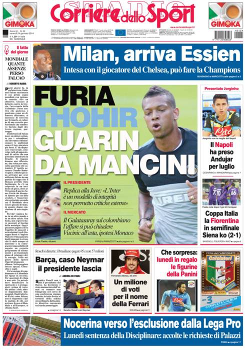 CORRIERE GUARIN – Fredy Guarin potrebbe volare in Turchia al Galatasaray, lo vuole Mancini. Thohir difende l’Inter dalla Juventus.