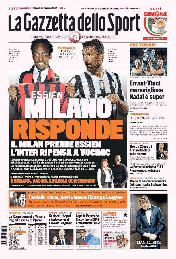 GAZZETTA INTER MILAN – Il Milan prende Essien per il centrocampo, l’Inter ripensa a Vucinic per l’attacco.