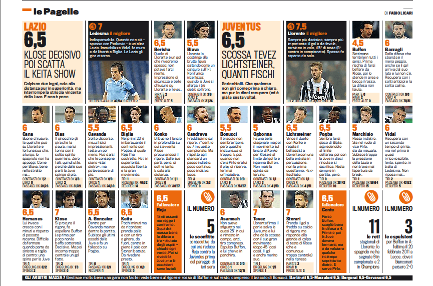 FANTACALCIO LAZIO JUVENTUS VOTI PAGELLE – La Juventus torna a Torino dalla trasferta dell’Olimpico con un punto in più in cassaforte anche se la Roma, oggi di scena a Verona, avrà l’occasione di portarsi a -6. Per come si era messa la gara, però, per la squadra di Antonio Conte si tratta di un punto importante guadagnato grazie al carattere di ferro di tutti. Per oltre un’ora, infatti, i bianconeri sono stati costretti a giocare in dieci a causa dell’espulsione di Gigi Buffon con relativo calcio di rigore assegnato alla Lazio e trasformato da Reja. La vecchia Signora strappa il pareggio grazie ad un bellissimo colpo di testa di Llorente, il migliore dei suoi. In assoluto il peggiore, invece, è stato Gigi Buffon. Trai biancocelesti, invece, la nota di merito va a Ledesma.