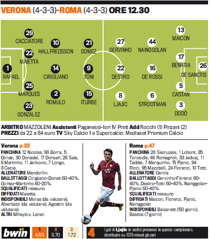 VERONA ROMA PROBABILI FORMAZIONI – Grande occasione per la Roma di Rudi Garcia nel lunch match delle 12.30 contro il Verona per accorciare la distanza della Juventus e allungare sul Napoli. Entrambe le formazioni, infatti, sono state bloccate da un pareggio e per i giallorossi l’occasione è davvero ghiotta. Per la sfida contro la Roma, Mandorlini schiererà il suo Verona con il 4-3-3 con Rafael in porta, Cacciatore, Maietta, Marques e Gongalez in difesa. Romulo, Cirigliano, Hallfredsson a centrocampo. Gomez, Toni e Iturbe in attacco. Rudi Garcia risponde anche con il solito 4-3-3 con De Sanctis tra i pali; Maicon, Benatia, Castan e Dodò in difesa. Strootman, De Rossi e Nainggolan a centrocampo. Gervinho, Destro e Ljajic in attacco.