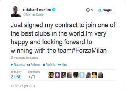 CALCIOMERCATO MILAN ESSIEN- Finalmente Michael Essien è un giocatore del Milan. Il centrocampista ghanese ha voluto esprimere la propria soddisfazione per il trasferimento pubblicando un post sul suo profilo twitter ufficiale: “Ho firmato con uno dei più grandi club del mondo. Ho appena firmato il contratto con uno dei più grandi club al mondo. Sono molto felice e non vedo l’ora di vincere con la squadra”.