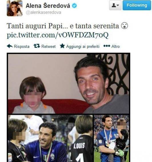 ALENA SEREDOVA FA GLI AUGURI A BUFFON – Alena Seredova non vuole sentir parlare di crisi con Gigi Buffon e nel giorno del compleanno del portiere della Juventus su Twitter, ha fatto pubblicamente gli auguri al marito nonché al padre dei suoi due figli. Alcuni ipotizzano che sia solo una conferma del fatto che i due siano ai ferri corti: Gigi Buffon non vuole sentire parlare della sua vita privata, continuano le indiscrezioni sulla presunta storia d’amore tra di lui e Ilaria D’Amico.