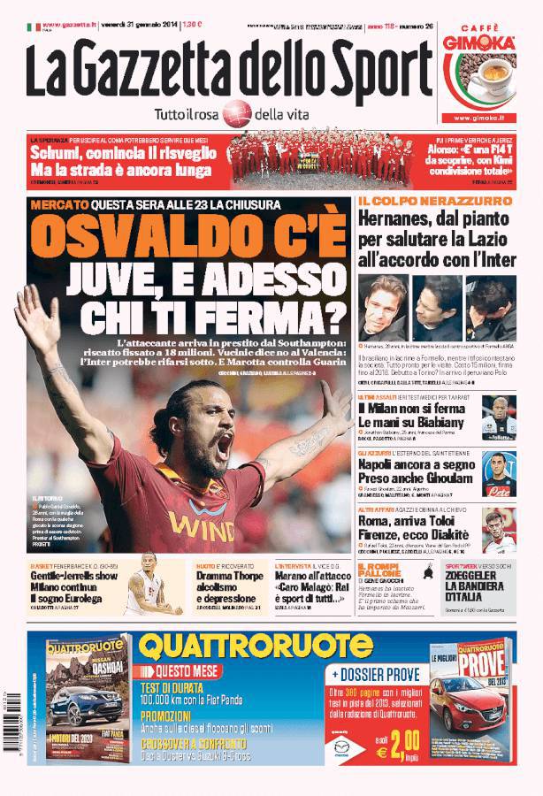 GAZZETTA JUVENTUS – Sulla Gazzetta dello Sport si parla di Osvaldo che è diventato un giocatore della Juventus.