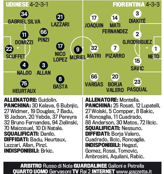 FOTO UDINESE FIORENTINA PROBABILI FORMAZIONI GUIDOLIN MURIEL – Inizia oggi la prima semifinale d’andata della Coppa Italia. Allo Stadio Friuli si affrontano l’Udinese di Guidolin e la Fiorentina di Vincenzo Montella. I friulani arrivano dall’importante vittoria contro il Bologna, la Fiorentina dovrà riscattare la sconfitta di Cagliari. Guidolin rispolvera Muriel prima punta con tre trequartisti dietro ovvero Nico Lopez, Lazzarri e Basta, con Pinzi e Allan cintura di centrocampo. Nella Fiorentina invece spazio al tridente d’attacco con Matri centrale d’attacco, Joaquin e Vargas esterni. Ecco le probabili formazioni secondo la Gazzetta dello Sport.