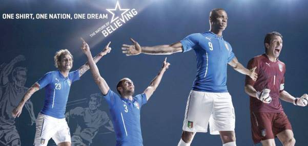 FOTO NAZIONALE UFFICIALE MAGLIA MONDIALI – Ecco la prima foto della maglia dei Mondiali dell’Italia che ha come testimonial Balotelli, Buffon, Diamanti e Chiellini. Solo il bolognese non ha il posto assicurato e dovrà sudarsi la convocazione magari salvando prima il club felsineo anche se in questi giorni potrebbe esserci il clamoroso addio con il Guangzhou di Lippi che è pronto a portarlo in Cina. La maglia degli azzurri è molto originale, attillata, con il collo a V. Ecco la prima immagine ufficiale.
