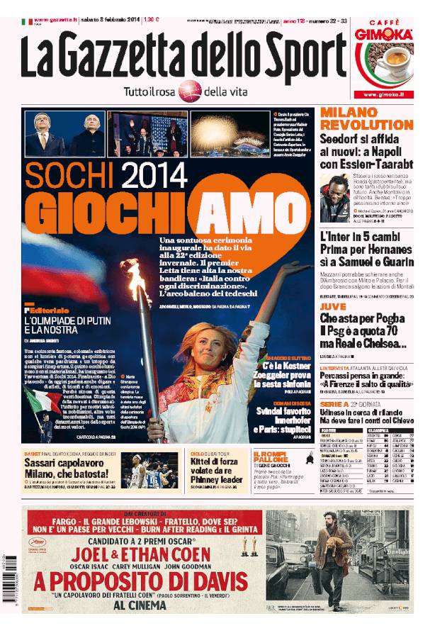 Gazzetta dello Sport – Sochi 2014 GiochiAMO 08/02/2014 di Admin3 GAZZETTA SOCHI – La Gazzetta dello Sport parla delle Olimpiadi invernali di Sochi del 2014 che si stanno svolgendo in Russia. La redazione di Calciomercatonews.com