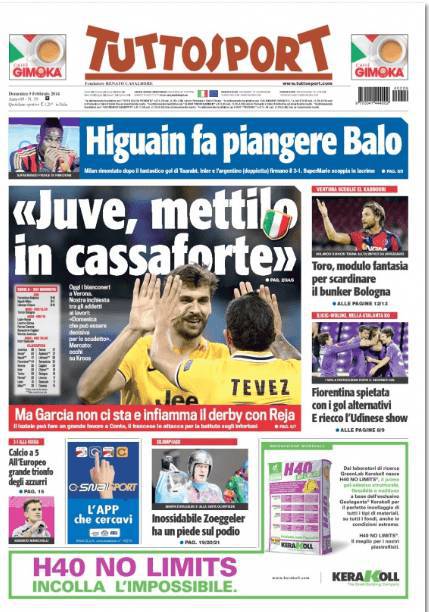 RASSEGNA STAMPA TUTTOSPORT – Oggi i bianconeri a Verona si giocano una fetta di scudetto. Garcia non ci sta e infiamma il derby con Reja. Higuain fa piangere Balotelli.