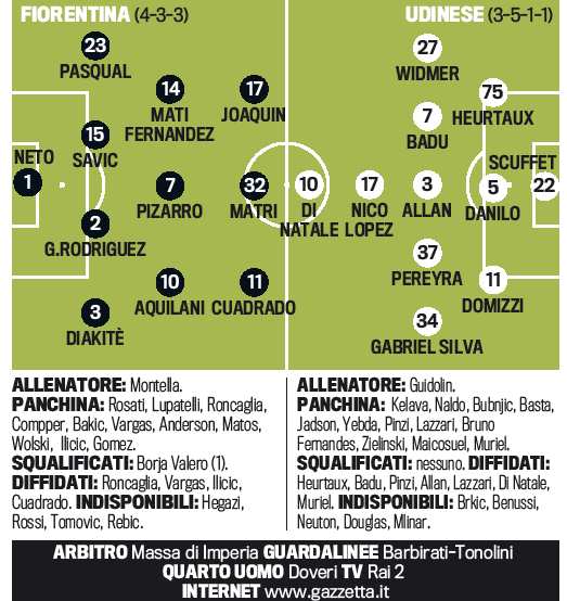FOTO FIORENTINA UDINESE PROBABILI FORMAZIONI MONTELLA CUADRADO – E’ la notte che può portare alla finale di Coppa Italia o la Fiorentina di Vincenzo Montella o l’Udinese di Francesco Guidolin. I due club sono pronti a darsi battaglia dopo il due a uno dell’andata che premiò i bianconeri friulani. Nella Fiorentina di Montella spazio al 4-3-3 con Matri centrale, Cuadrado a destra e Joaquin a sinistra. A centrocampo Aquilani, Pizarro e Mati Fernandez. Nell’Udinese invece Guidolin sceglie Nico Lopez come partner di Totò Di Natale che vuole assolutamente la finale. Il Franchi sarà tutto pieno e potrà esultare per l’eventuale ritorno in campo di Mario Gomez che è stato convocato. Le probabili secondo la Gazzetta dello Sport.