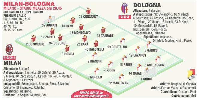 FOTO MILAN BOLOGNA PROBABILI FORMAZIONI HONDA CRISTALDO – Clarence Seedorf non ha intenzione di cambiare modulo e anche questa sera contro il Bologna punterà sul 4-2-3-1. In cabina di regia torna Montolivo accanto a De Jong, torna in campo Honda come esterno di sinistra nella linea dei trequartisti, mentre Kakà e Taarabt completeranno il quadro. In attacco solo Balotelli, Seedorf per ora non vuole portare avanti l’esperimento della coppia con Pazzini. Nel Bologna conferma per l’eroe di Torino, ovvero Cristaldo, accanto a lui Bianchi, mentre a centrocampo saranno cinque i giocatori che cercheranno di conquistare la mediana. Le formazioni secondo il Corriere dello Sport.