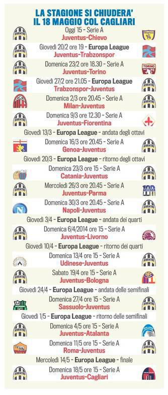 FOTO JUVENTUS TOUR DE FORCE – Inizia da oggi, con la sfida con il Chievo Verona, la discesa finale del campionato della Juventus. Saranno 3 mesi di fuoco per la squadra di Antonio Conte, pronta a chiudere il campionato in casa contro il Cagliari il prossimo 18 maggio. Occhio però al cammino in Europa League: si partirà con il Trabzonspor già giovedì, ma in caso di passaggio al turno successivo, cosa a cui Conte ambisce, aumenteranno a dismisura gli impegni della squadra bianconera di qui a fine stagione. La foto tratta dall’edizione di Tuttosport mostra un calendario davvero di ferro. Il double è un obiettivo concreto, per raggiungerlo però bisognerà affrontare il calendario al meglio.