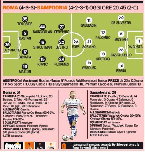 ROMA SAMPDORIA PROBABILI FORMAZIONI – La Roma vuole subito buttarsi alla spalle la disfatta di Napoli. Per riscattarsi, anche senza l’appoggio dei tifosi e senza Francesco Totti, cercherà la vittoria contro la Sampdoria nel posticipo della 24a giornata di serie A. Rudi Garcia schiererà la Roma con il solito 4-3-3 con De Sanctis in porta, Maicon, Benatia, Castan, Torosidis in difesa. Strootman, Pjanic e Nainggolan a centrocampo. Florenzi, Destro e Gervinho in attacco. Mihajlovic risponde con il 4-2-3-1 con Da Costa in porta; De Silvestri, Mustafi, Gastaldello e Regini in difesa. Palombo e Krsticic in mezzo al campo. Gabbiadini, Soriano e Wszolek sulla trequarti a sostegno dell’unica punta che sarà Eder.