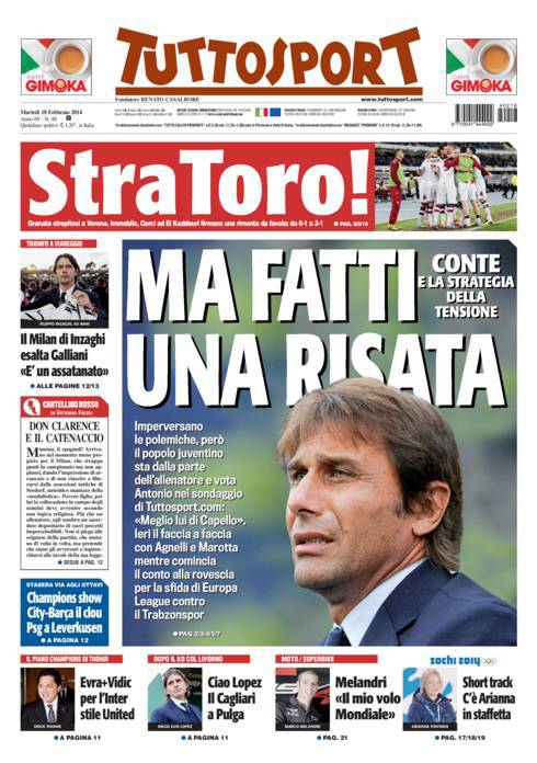 Tuttosport – Ma fatti una risata 18/02/2014 di Admin3 TUTTOSPORT CONTE – Su Tuttosport si parla di Antonio Conte che viene invitato a sorridere da parte dei lettori di Tuttosport che gli danno ragione nella diatriba con Capello. la redazione di Calciomercatonews.com