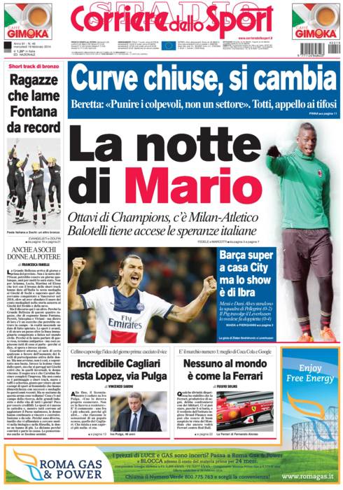MILAN CHAMPIONS LEAGUE PRIMA PAGINA CORRIERE DELLO SPORT- Balotelli è l’uomo si cui si poggiano le speranze del Milan questa sera contro l’Atletico Madrid.