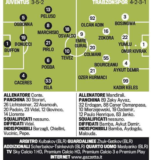FOTO JUVENTUS TRABZONSPOR PROBABILI FORMAZIONI VIDAL OSVALDO TEVEZ – La Juventus questa sera alle ore 19 affronterà allo Juventus Stadium il Trabzonspor, squadra turca che vorrà rovinare i piani dei bianconeri. Antonio Conte concederà un turno di riposo a qualche giocatore, in attacco non ci sarà Llorente, spazio a Osvaldo che giocherà in coppia con Tevez. A centrocampo fuori Vidal e dentro Marchisio, con Pogba che scalerà dall’altro lato, in difesa sia Ogbonna che Caceres. Nel Trabzonspor in difesa ci sarà l’ex Chelsea Bosingwa, a centrocampo Zokora, in attacco Emre Gural. Probabili formazioni secondo la Gazzetta dello Sport.