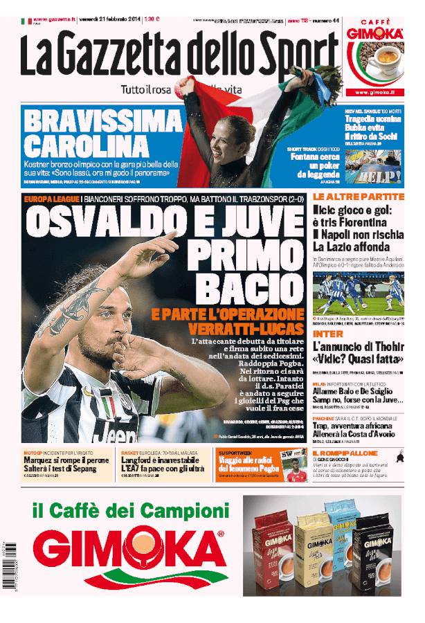 Gazzetta dello Sport – Osvaldo e Juve primo bacio 21/02/2014 di Admin3 GAZZETTA OSVALDO JUVENTUS – La Gazzetta dello Sport parla della Juventus che vince due a zero contro il Trabzonspor con il primo gol di Osvaldo. la redazione di Calciomercatonews.com