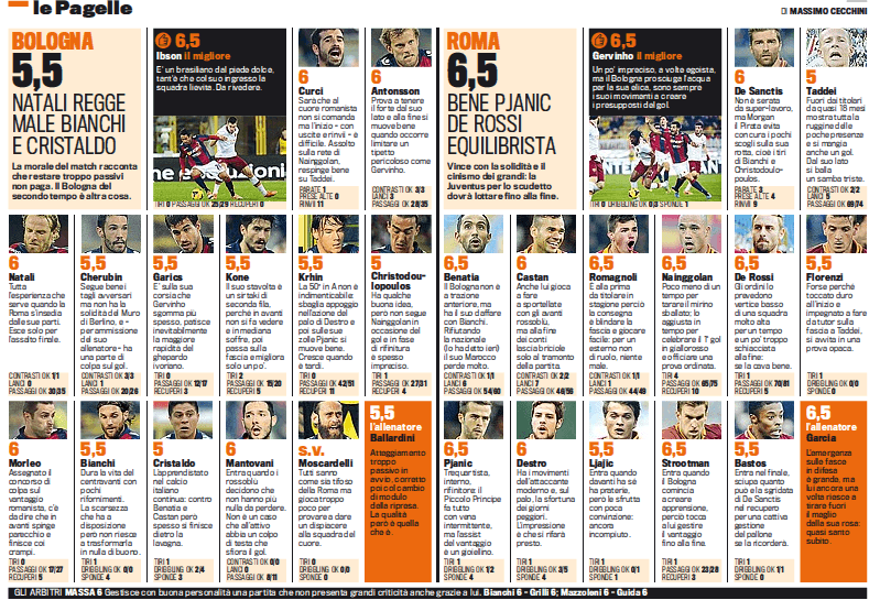 FANTACALCIO BOLOGNA ROMA VOTI E PAGELLE DELLA GAZZETTA DELLO SPORT – La Roma vince di misura a Bologna grazie ad un gol di Nainggolan e mette pressione alla Juventus che oggi sarà impegnata nel derby contro il Torino. Il migliore della formazione giallorosso, per la gazzetta dello Sport, è stato l’ivoriano Gervinho che, sebbene sia stato un po’ impreciso rispetto ad altre occasioni, semina il panico quando parte con la sua corsa. Bene anche Pjanic che illumina la sua squadra in assenza di Totti così come De Rossi, Benatia e il giovane Romagnoli, promosso a pieni voti. Nel Bologna, invece, è Ibson, brasiliano dai piedi buoni che con il suo ingresso dà la scossa all’intera squadra.