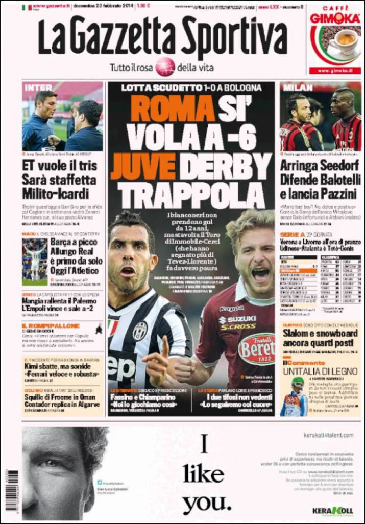 RASSEGNA STAMPA GAZZETTA DELLO SPORT – I bianconeri non prendono gol da 12 anni ma stavolta il Toro di Cerci e Immobile (che hanno segnato più di Tevez e Llorente) fa davvero paura. Arringa Seedorf: difense Balotelli e lancia Pazzini. Erik Thohir vuole il tris: sarà staffetta Milito-Icardi.