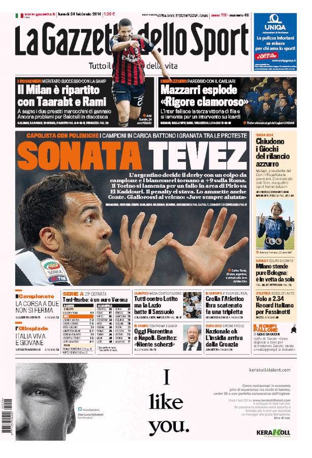 Gazzetta dello Sport – Sonata Tevez 24/02/2014 di Admin3 GAZZETTA TEVEZ – La Juventus vince uno a zero contro il Torino tra le proteste dei granata e anche della Roma. La redazione di Calciomercatonews.com