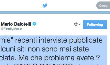 MARIO BALOTELLI TWITTER GIORNALISTI- Continua l’eterna querelle tra Mario Balotelli ed i giornalisti. Affidando le sue parole ancora una volta a Twitter, l’attaccante italiano questa volta accusa la categoria di riportare interviste mai rilasciate e non va per il sottile:”Le “mie” recenti interviste pubblicate da alcuni siti non sono mai state rilasciate. Ma che problema avete ? Quando PARLO DAVVERO si nota!“. Non è la prima volta che il rossonero si scaglia contro i giornalisti: la più famosa forse risale a quando la Gazzetta dello Sport lo insignì del titolo di “idolo dell’anticamorra“, in occasione di una partita della nazionale giocata a Napoli.