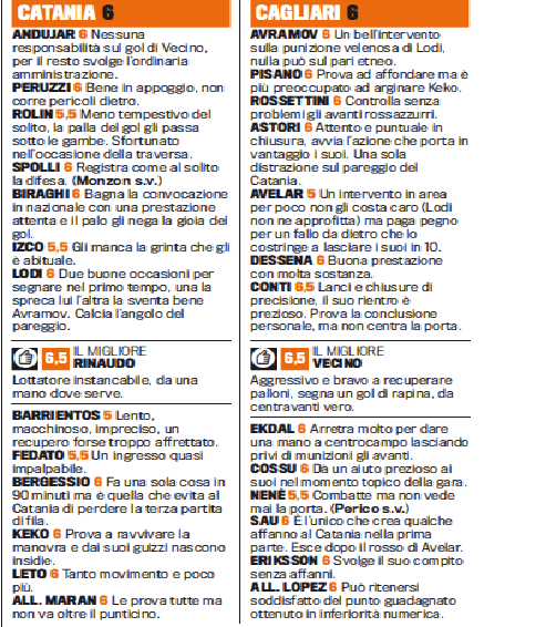 FANTACALCIO CATANIA CAGLIARI VOTI PAGELLE GAZZETTA DELLO SPORT – Il Cagliari inguaia il Catania bloccandolo su un pareggio che agli etnei non serve a nulla. Per cercare di raggiungere la salvezza, alla squadra di Maran serve davvero un miracolo. Tra gli etnei, il migliore è stato Rinaudo, come scrive la Gazzetta dello Sport, autore i una prova da lottatore vero. Instancabile, lotta su tutti i palloni per tutta la gara. Delude, invece, Izco che gioca una partita senza grinta e si vede. Nel Cagliari, invece, il migliore è stato Vecino, bravo e aggressivo a recuperare palloni e a segnare un gol da rapina, da bomber vero.