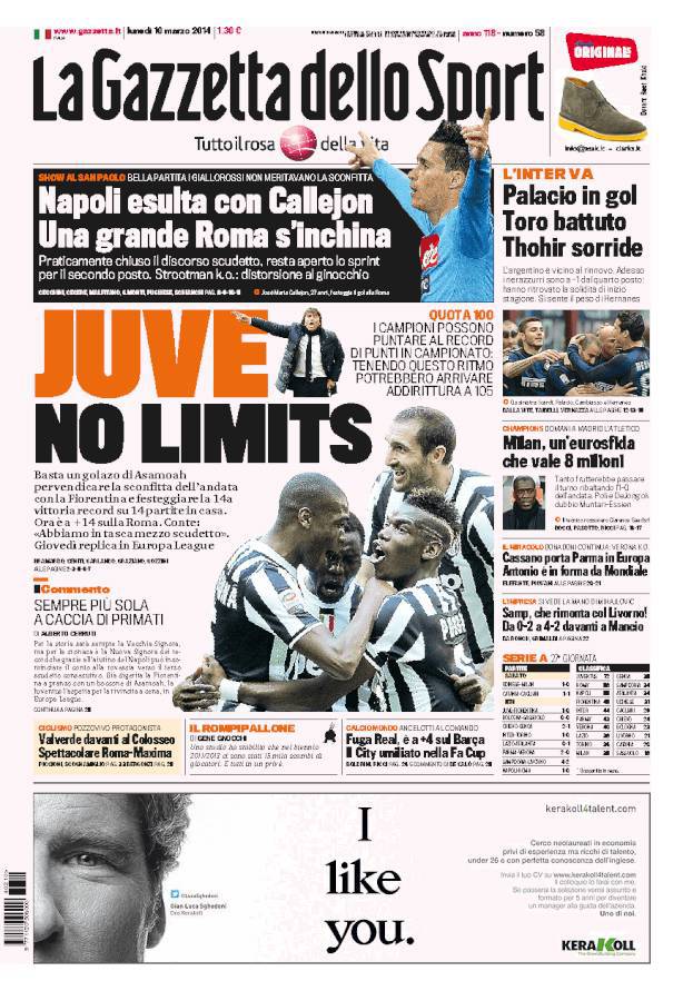 Gazzetta dello Sport – Juve no limits 10/03/2014 di Admin3 GAZZETTA JUVENTUS – Sulla Gazzetta dello Sport si parla della Juventus che vince uno a zero contro la Fiorentina grazie al gol di Asamoah. la redazione di Calciomercatonews.com