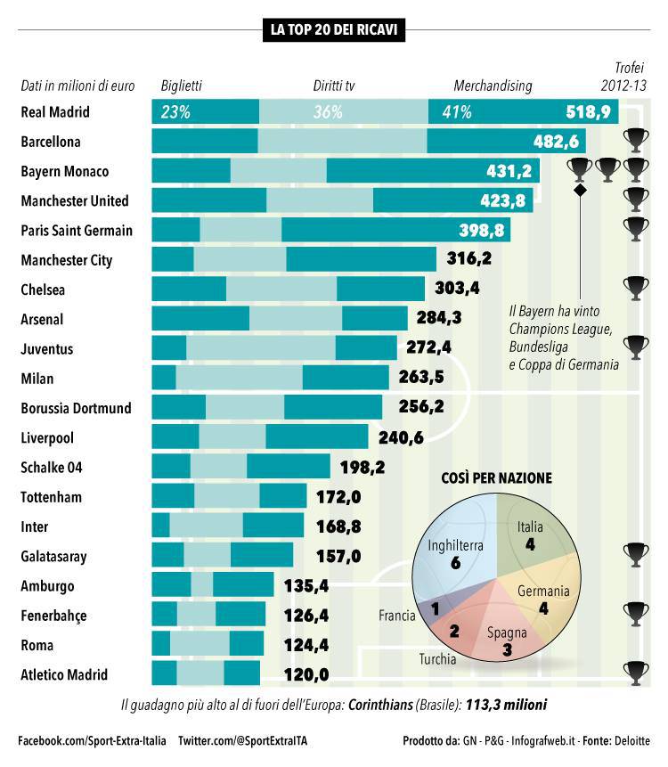 TOP 20 RICAVI – Non è un periodo di vacche grasse per il calcio italiano e se ne può avere l’ennesima conferma osservando la top 20 delle squadre europee dai ricavi più alti. Questi derivano da tre fonti di guadagno: i biglietti venduti nelle partite casalinghe, i diritti tv e il merchandising. In questa foto tratta da Sport Extra troviamo i club più ricchi del continente. Al comando resta saldo il Real Madrid con l’immenso fatturato di 518.9 milioni di euro seguito dal Barcellona a 482.6 milioni di euro; terzo posto per il Bayern di Guardiola (431.2 milioni di euro). La prima italiana è la Juventus in posizione numero nove con ricavi pari a 272.4 milioni di euro: il Milan segue al decimo posto con 263.5 milioni di euro. Soltanto quindicesima l’Inter (168.8) mentre la Roma è diciannovesima (124.4).