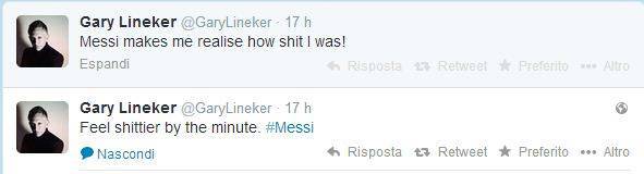 LINEKER MESSI – Lionel Messi continua ad incantare. Ieri sera, in campo al Camp Nou, ha trascinato il Barcellona ai quarti di finale di Champions League contro il Manchester City con una prestazione sontuosa. A guardare la Pulce, oltre ai tifosi e agli appassionati del calcio, c’era anche l’ex calciatore inglese Gary Lineker che, su ‘Twitter’ ha espresso tutta la sua ammirazione per l’argentino scrivendo il seguente messaggio: “Vedere giocare Messi mi ha fatto capire quanto io fossi una me..a in campo”.