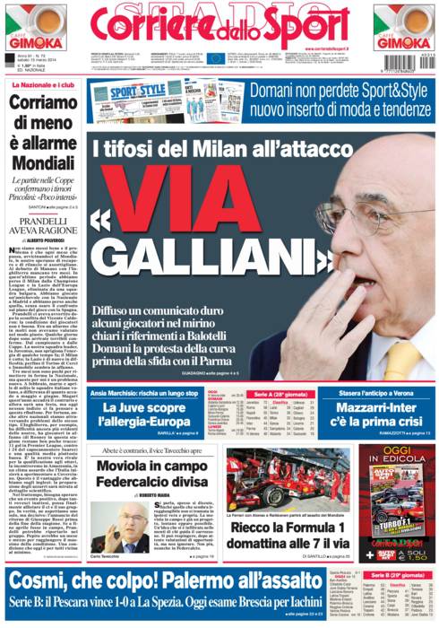 Corriere dello Sport – Via Galliani 15/03/2014 di Ruggieri CORRIERE GALLIANI – Duro comunicato dei tifosi del Milan contro Galliani e anche nei confronti di qualche giocatore, Balotelli nel mirino. la redazione di Calciomercatonews.com