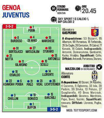 FOTO GENOA JUVENTUS PROBABILI FORMAZIONI – Prosegue il periodo davvero intenso della stagione della Juventus. Non c’è sosta tra Europa League e campionato per gli uomini di Antonio Conte, alla ricerca costante di vittorie che possano garantire un’ottima prosecuzione di questa difficile stagione. Tappa obbligata è quella dello stadio Ferraris: questa sera, alle 20.45, un Genoa affamato e per nulla arrendevole, ospiterà la squadra due volte campione d’Italia. Quali le scelte dei due tecnici Gasperini e Conte per la gara di questa sera? Ci viene in aiuto la grafica di Tuttosport che anticipa le decisioni degli allenatori: