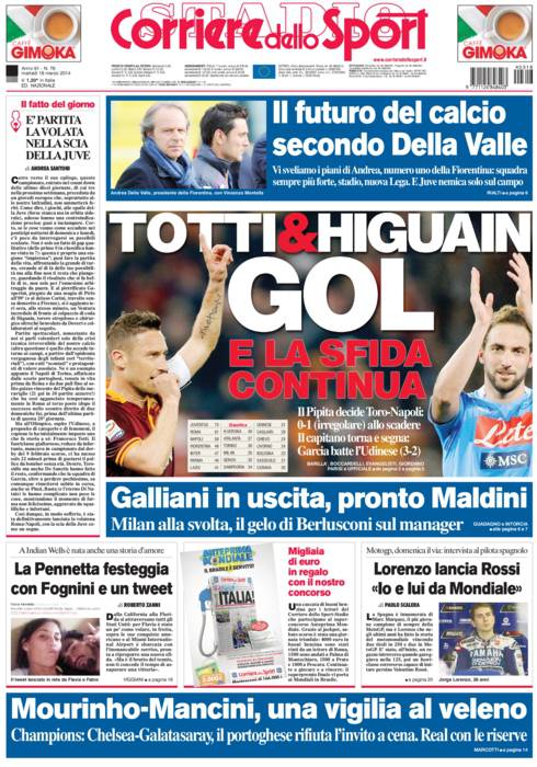 Corriere dello Sport – Totti e Higuain gol, la sfida continua 18/03/2014 di Ruggieri CORRIERE TOTTI HIGUAIN – Roma e Napoli vincono anche grazie ai propri campioni Totti e Higuain. la redazione di calciomercatonews.com