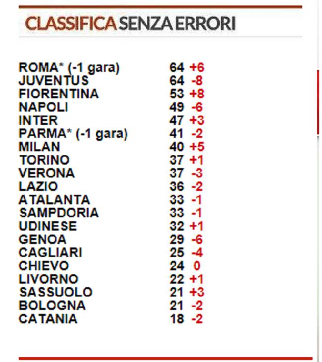 SERIE A LA CLASSIFICA SENZA ERRORI ARBITRALI – La lotta scudetto può già considerarsi chiusa con la Juventus a +14 dalla Roma che è sempre seconda e mantiene i tre punti di vantaggio sul Napoli, terzo. Tuttavia, senza gli errori arbitrali, il campionato sarebbe apertissimo con Roma e Juventus al primo posto con 64 punti. Il Napoli, invece, scenderebbe al quarto posto a 49 punti. Nella 28a giornata di serie A, tuttavia, gli errori in Genoa-Juventus sono stati ininfluenti mentre pesano gli errori in Torino-Napoli. Non s capisce perché Doveri lasci correre Higuain nell’azione che poi permette al Napoli di battere il Torino e portare a casa i tre punti. Ecco dunque la classifica senza errori arbitrali di Panorama.it