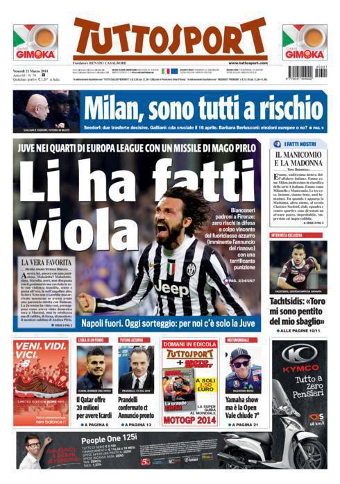 Tuttosport – Li ha fatti viola 21/03/2014 di Ruggieri TUTTOSPORT PIRLO – Su Tuttosport si parla di Pirlo che ha deciso il match tra Fiorentina e Juventus con un esemplare calcio di punizione. la redazione di Calciomercatonews.com