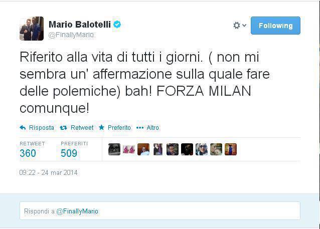 MILAN BALOTELLI – Al termine di Lazio-Milan sul profilo Twitter di SuperMario era apparso questo tweet: “La vita è piena di gente falsa, non credere a nessuno“. In molti hanno subito considerato il mittente della frecciatina Clarence Seedorf per via dell’esclusione riservata a Balotelli nella sfida dell’Olimpico. C’ha però pensato lo stesso giocatore a smorzare ogni dubbio pubblicando un altro tweet: “Riferito alla vita di tutti i giorni. ( non mi sembra un’ affermazione sulla quale fare delle polemiche) bah! FORZA MILAN comunque!”.