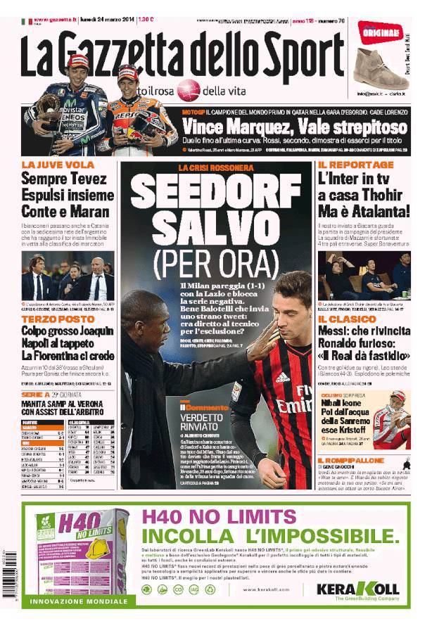 Gazzetta dello Sport – Seedorf salvo (per ora) 24/03/2014 di Ruggieri GAZZETTA SEEDORF – Il Milan ha deciso di confermare Clarence Seedorf in panchina dopo il pareggio contro la Lazio che ha bloccato la crisi rossonera. la redazione di Calciomercatonews.com
