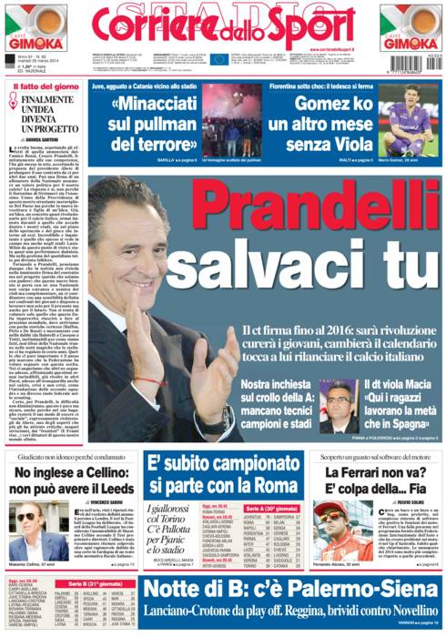 Corriere dello Sport – Prandelli salvaci tu 25/03/2014 di Ruggieri CORRIERE PRANDELLI – Sul Corriere dello Sport si parla di Prandelli che rinnoverà il contratto con l’Italia fino al 2016 e curerà l’aspetto dei calendari e tanto altro. la redazione di Calciomercatonews.com