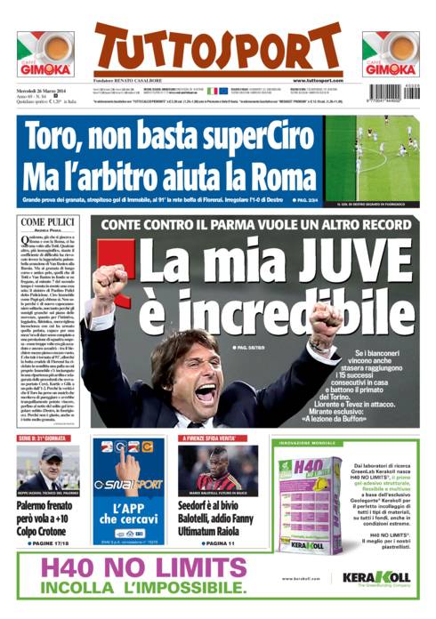 Tuttosport – ‘La mia Juve è incredibile’ 26/03/2014 di Ruggieri TUTTOSPORT JUVENTUS – Su Tuttosport si parla di Conte che elogia la Juventus. Grande cavalcata dei bianconeri in campionato. la redazione di Calciomercatonews.com