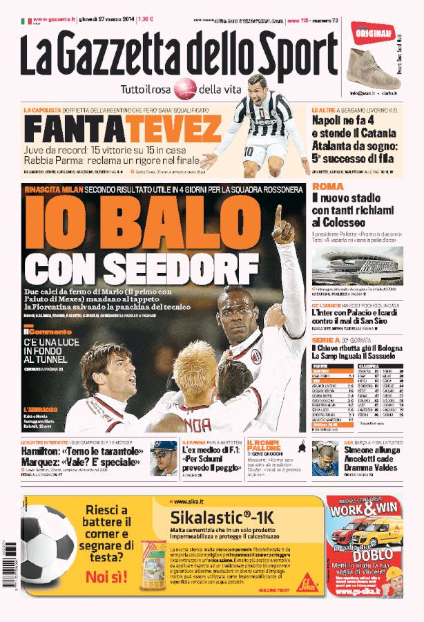 GAZZETTA BALOTELLI – Il Milan vince clamorosamente a Firenze per due a zero con Balotelli autentico protagonista.
