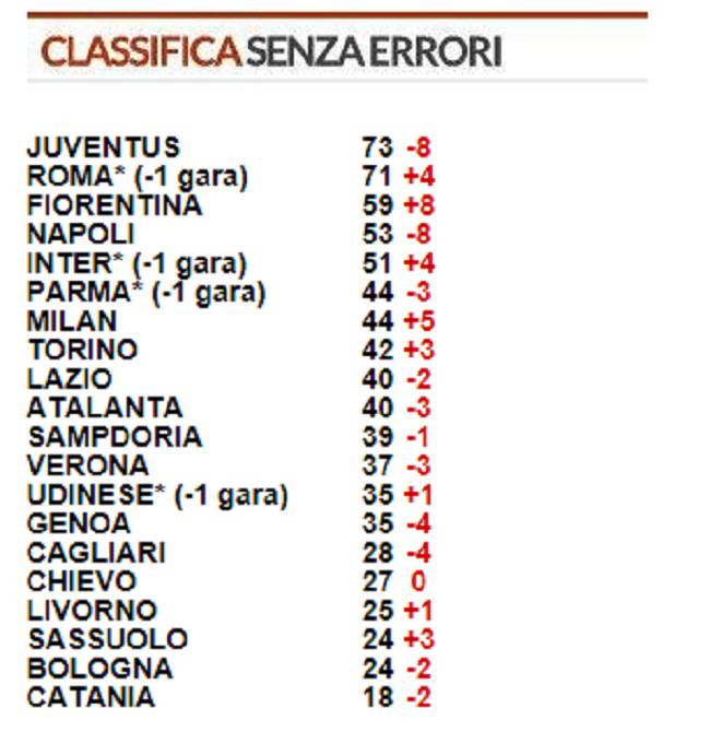 SERIE A LA CLASSIFICA SENZA ERRORI ARBITRALI – Non è stato un mercoledì semplice per gli arbitri italiani, in particolare per Peruzzo che sbaglia tutto in Genoa-Lazio non dando un rigore per parte. Sbaglia anche Banti sull’espulsione di Amauri che le moviole evidenziano come non si tratti di un atto cattivo e sbaglia non espellendo Tevez per una manata che gli costa il cartellino giallo e la squalifica. Fuorigioco millimetrico di Destro in Roma-Torino e fuorigioco anche in Sassuolo-Sampdoria sul gol di Longhi. Ecco, dunque, la classifica senza errori arbitrali ricostruita da Panorama.it.